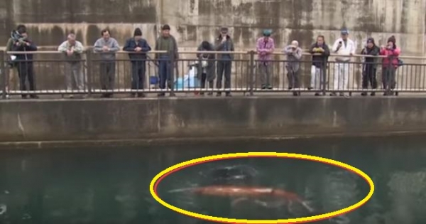 在日本富山灣的海邊,有許多遊客正在散步,突然水中有點異樣,有人發現水面下竟有一個巨大的紅色生物。