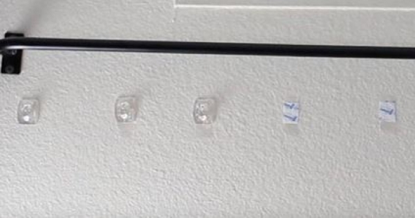 2.在窗簾桿下依間距黏上一排掛勾,用可重複拆除、黏貼的掛勾就不會傷到牆面。