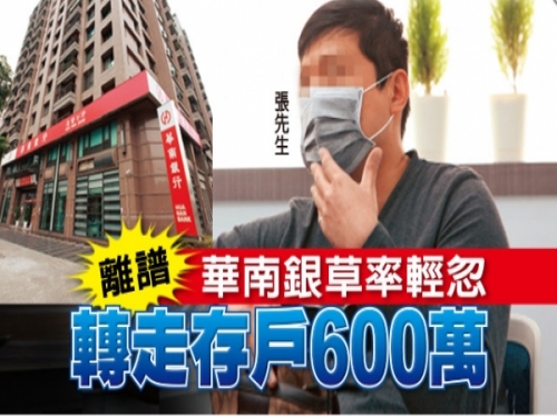 根據《壹週刊》報導,張先生找華南銀質問,華南回覆有位林小姐,向警局報案說遭詐騙1000萬,其中600萬輾轉進入張先生在華南銀行的戶頭,銀行接獲通知將他的帳戶列為警示帳戶,並依《存款帳戶及其疑似不法或顯屬異常交易管理辦法》在找不到張先生的情況之下,讓檢附相關文件資料的林小姐簽下切結書後領走張先生帳戶的600萬元。