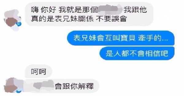 我:表妹?怎麼可能,我昨天看你手機明明就互稱寶貝,到底還要騙多久?你們這樣多久了?