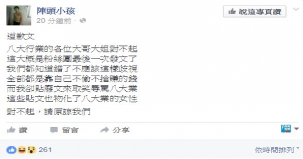 「八大行業的各位大哥大姐對不起,這大概是粉絲團最後一次發文了,我們都知道錯了不應該這樣歧視,全部都是靠自己不偷不搶賺的錢,而我卻貼廢文來取笑辱罵八大業,這些貼文也物化了八大業的女性,對不起,請原諒我們」。