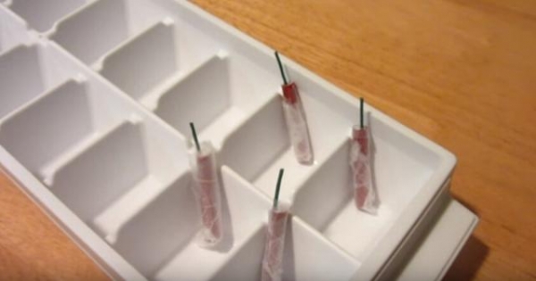 接著把包裹好的鞭炮放入冰箱內冷藏,然後倒水結冰。