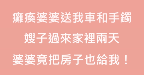 哈摟哈摟各位讀者~~我是有錢人這麼想小編Choco!今天要來說說關於「68歲癱瘓婆婆送我車和手鐲,嫂子過來照顧兩天,婆婆竟把房子也給我!」,不知道大家有沒有興趣呢!一起來看看是怎麼樣的事吧!