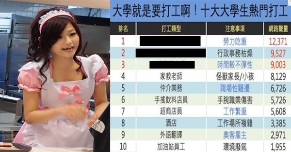 第一名居然是餐飲業服務生,其次是行政工讀和補習班老師!