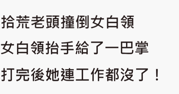 哈摟哈摟各位讀者~~我是有錢人這麼想小編Choco!今天要來說說關於「拾荒老頭撞倒女白領,女白領抬手給了一巴掌,打完她後她連工作都沒了!」,不知道大家有沒有興趣呢!一起來看看是怎麼樣的事吧!