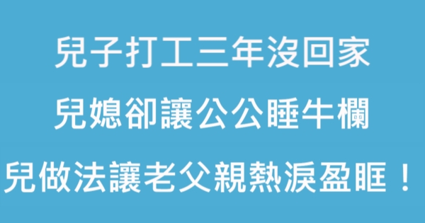 大家好,我是 Choco 今天來跟你說說 兒子打工三年沒回家,兒媳卻讓公公睡牛欄,兒做法讓老父親熱淚盈眶!吧!讓我們來看看!