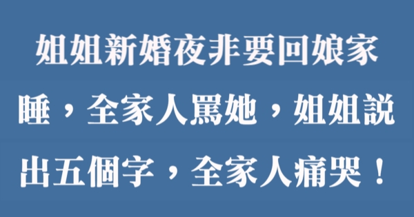 哈摟哈摟親愛的大家~~我是有錢人這麼想小編Choco!今天要來說說關「姐姐新婚夜非要回娘家睡,全家人罵她,姐姐說出五個字,全家人痛哭!」的事件!讓我們一起來看看吧!