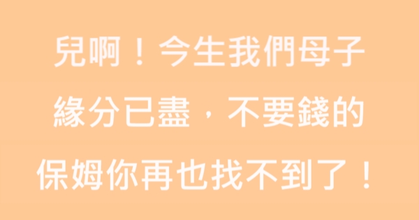 大家好,我是 Choco 今天來跟你說說 兒啊!今生我們母子緣分已盡,不要錢的保姆你再也找不到了!吧!讓我們來看看!