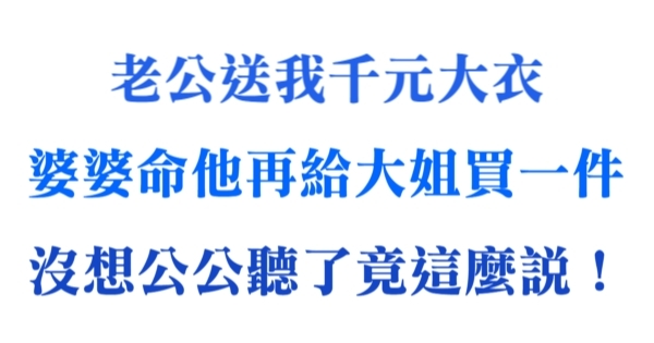 大家好,我是有錢人這麼想小編Choco!今天要來說說關於老公送我千元大衣,婆婆命他再給大姑姐買一件,沒想公公聽了竟這麼說!的事!不知道大家對於這個有多了解呢?一起來看看吧!