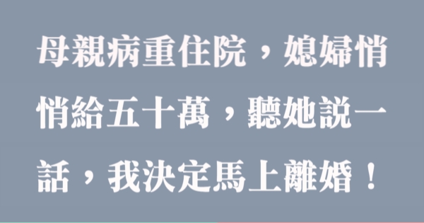 哈摟哈摟各位讀者~~我是有錢人這麼想小編Choco!今天要來說說關於「母親病重住院,媳婦悄悄給五十萬,聽她說一話,我決定馬上離婚!」,不知道大家有沒有興趣呢!一起來看看是怎麼樣的事吧!