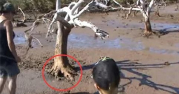 國外一家人來到這處泥灘上,泥灘上長著不少沒有枝葉的樹。他們發現樹根部的洞穴裡面有動靜,沒想到最後在裡面抓到這個。