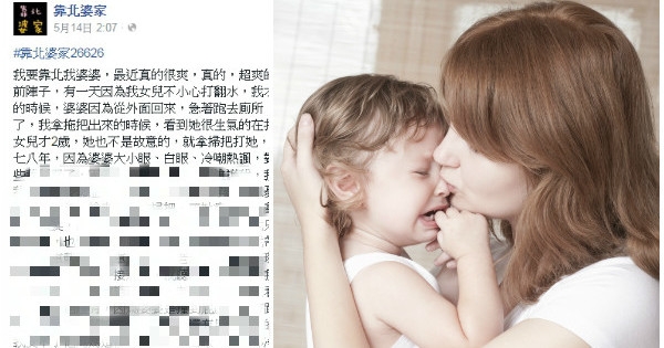 前陣子,有一天因為我女兒不小心打翻水,我才剛看到,要去拿拖把擦的時候,婆婆因為從外面回來,急著跑去廁所,沒穿室內鞋,就跌倒了,我拿拖把出來的時候,看到她很生氣的在打我女兒,不是用手,我女兒才2歲,她也不是故意的,就拿掃把打她,我在他們家風平浪靜了七八年,因為婆婆大小眼、白眼、冷嘲熱諷,對我兒子跟女兒偏心,這些我都忍了,因為老公對我超好,都維護我,我也不用討好他媽媽。