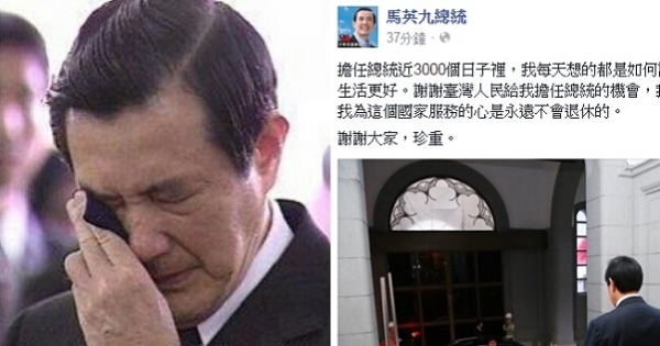 在19日,是馬英九的任期最後一天,他在臉書上寫下短短幾句話,PO不到半小時,已經有超過五萬人點讚與分享。他回顧這八年的任期,他表示:謝謝臺灣人民我擔任總統的機會。