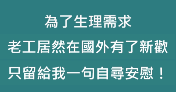 哈摟哈摟各位讀者~~我是有錢人這麼想小編Pineapple!今天要來說說關於「為了生理需求,老工居然在國外有了新歡,只留給我一句自尋安慰!」,不知道大家有沒有興趣呢!一起來看看是怎麼樣的事吧!