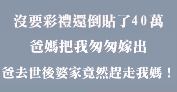 哈摟哈摟各位讀者~~我是有錢人這麼想小編Pineapple!今天要來說說關於「沒要彩禮還倒貼了40萬,爸媽把我匆匆嫁出,爸去世後婆家竟然趕走我媽!」,不知道大家有沒有興趣呢!一起來看看是怎麼樣的事吧!