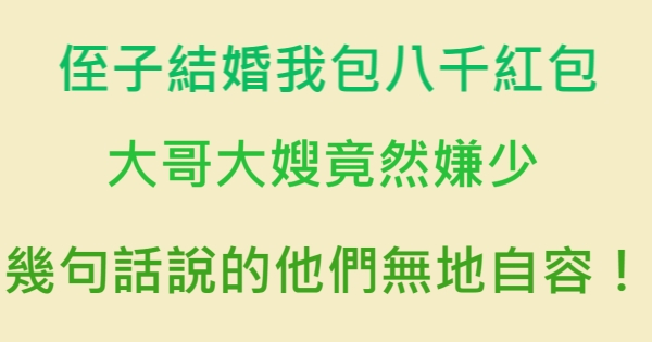 哈摟哈摟各位讀者~~我是有錢人這麼想小編Pineapple!今天要來說說關於「侄子結婚我包八千紅包,大哥大嫂竟然嫌少,幾句話說的他們無地自容!」,不知道大家有沒有興趣呢!一起來看看是怎麼樣的事吧!