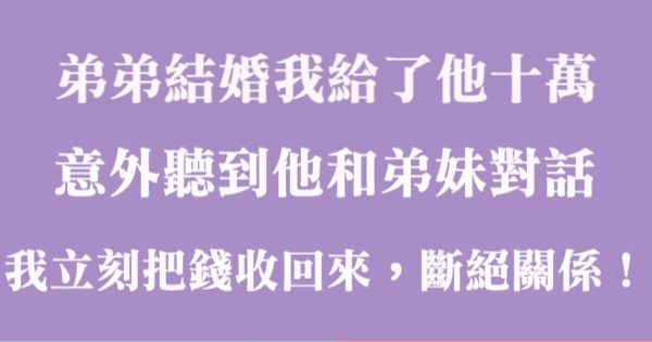 哈摟哈摟各位讀者~~我是有錢人這麼想小編Pineapple!今天要來說說關於「弟弟結婚我給了他十萬,意外聽到他和弟妹對話,我立刻把錢收回來,斷絕關係!」,不知道大家有沒有興趣呢!一起來看看是怎麼樣的事吧!