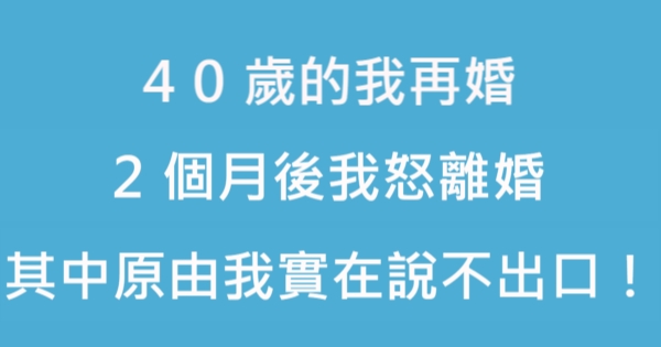 哈摟哈摟各位讀者~~我是有錢人這麼想小編Pineapple!今天要來說說關於「40歲的我再婚,2個月後我怒離婚,其中原由我實在說不出口!」,不知道大家有沒有興趣呢!一起來看看是怎麼樣的事吧!