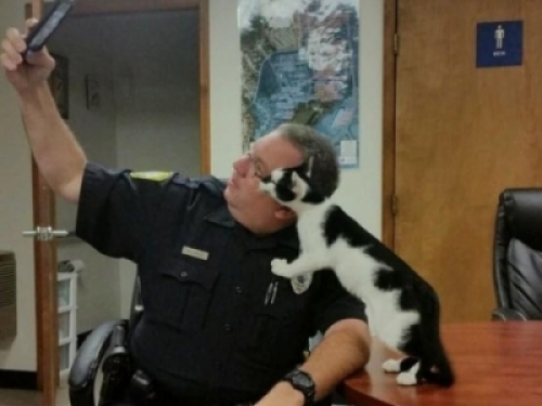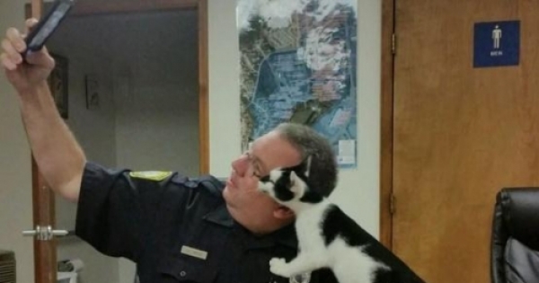 美國有一隻非常親人的流浪貓Kingsley,牠不只在街上晃,甚至還晃進了警察局裡。這些警察叔叔對於這個意外的訪客,不但沒有人想要把牠趕走,反而因為喵貓實在是太可愛又愛撒嬌,馬上就收服了這群外表粗獷的警察們,把他們的心完全萌到融化!