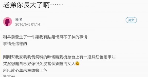 × 接收更多熱門話題 讚一下,我們會更努力! {DM_AfterTag} 新奇 愛堅強 女大生去洗澡突發超尷尬狀況,竟是因為弟弟的... ----------------------------- Dcard原文: 沒想到到吾家有弟初長成啊~~~這下真的讓姊姊驚呆囉XD 分享出去這個很有趣的文章吧!! 文章來源精彩文章:台灣第一名拉麵「鬼金棒」宣佈漲價 粉絲超開心:早該漲了 看更多!請加入我們的粉絲團 男友載她出車禍,讓她生命垂危昏迷不醒!她卻在300天離奇消失... 如果你已經50-80歲了,一定要看看這篇文章! 轉載請附文章網址