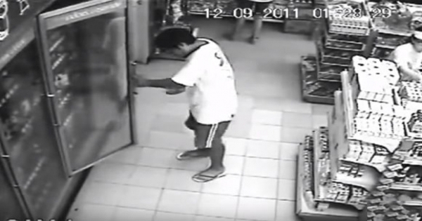 ▼監視器影片中可以看到這名男子在商店裡正開冰箱門拿飲料出來。