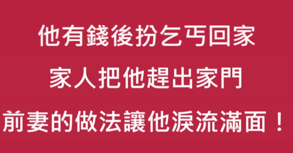 哈摟哈摟各位讀者~~我是有錢人這麼想小編Choco!今天要來說說關於「他有錢後扮乞丐回家,家人把他趕出家門,前妻的做法讓他淚流滿面!」,不知道大家有沒有興趣呢!一起來看看是怎麼樣的事吧!