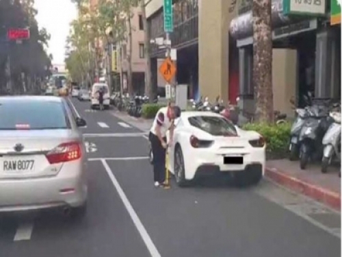 近日有網友在爆廢公社PO出一段影片,在台北市街頭看到一名法拉利車主將車停在路邊,正拿著直立式打氣筒給法拉利輪胎打氣。