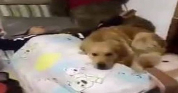 隨後假裝嘔吐完的主人又再次直接假裝昏睡過去,隻見金毛這次是直接叼來了一張毯子幫忙搭在了鏟屎官的身上並靜靜地守護在鏟屎的身邊,就像是一位暖心的家庭小保姆。