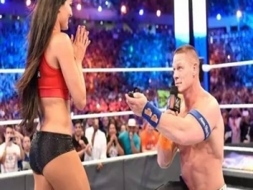 才剛和女友Nikki Bella 於《 WWE WrestleMania 》雙打賽中取得勝利, John Cena 忽然於擂台上單膝下跪,對著女友蜜意握別、拿出鑽戒,向來往五年的女友溫柔求婚。