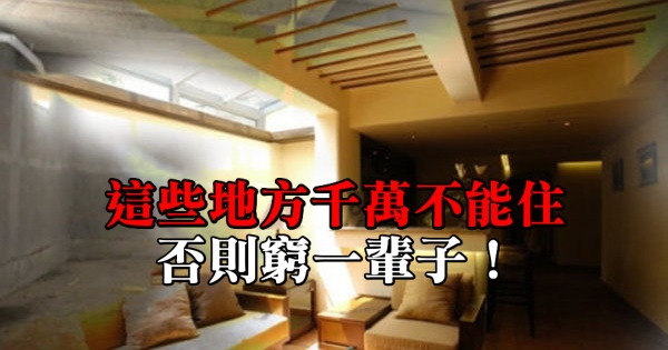 第一類:地下室。有些人或許因為各種原因住在了地下室,當然住的時間短無所謂,但是若長期住於此,可是會越過越窘迫的,除了財運倍受影響外,亦影響個人情感。現實中有些富豪也喜住在地下,甚至將地下室裝修得富麗堂皇以求突顯個性,實際上這並不是一個好舉措。建議住在地下室的朋友盡量趁早搬離出去,且需選擇能見陽光的屋子。