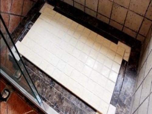 先給大家看看常規的拉槽處理是啥樣的,其實很簡單,就是中間主要洗浴的地方墊高一些,四邊略微低下去一些,中間那一塊上用整塊石材拉出一個個小槽,便於排水,這樣也能防滑。