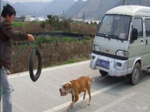 呃,如此狗狗訓練,小編也是醉了。但這還不是最“魔鬼”的,有位比特犬主人曾訓練狗狗拉汽車,掛著空檔坐著駕駛員,比特犬竟然拉著往前走了150米,又返回走了40米,最後實在氣喘籲籲走不動了才停下來。