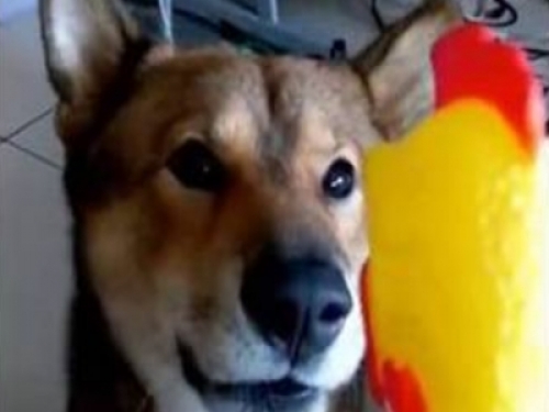 這不,一隻柴犬汪星人就和主人的“慘叫雞”玩具給杠上了。