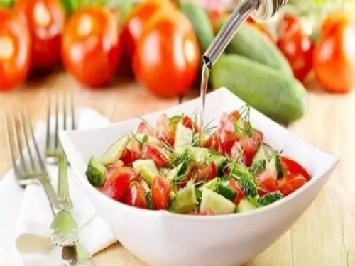 3、黃瓜、西紅柿、香菜、洋蔥拌勻,放一點雞精、糖、醋、香油。