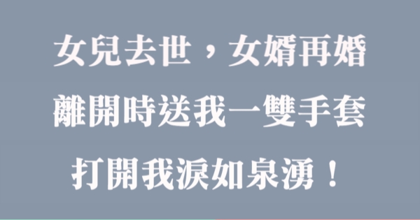 大家好,我是Choco 今天來跟你說說 女兒去世,女婿再婚,離開時送我一雙手套,打開我淚如泉湧!吧!