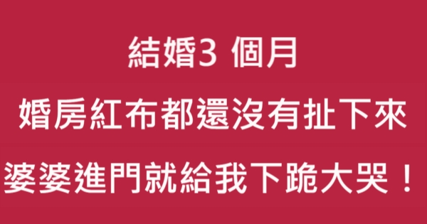 哈摟哈摟各位讀者~~我是有錢人這麼想小編Choco!今天要來說說關於「結婚3個月,婚房紅布都還沒有扯下來,婆婆進門就給我下跪大哭!」,不知道大家有沒有興趣呢!一起來看看是怎麼樣的事吧!