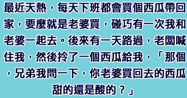 最近天熱,每天下班都會買個西瓜帶回家,要麼就是老婆買,碰巧有一次我和老婆一起去的,老闆一看我倆是夫妻,多送了我們一個。後來有一天路過,老闆喊住我,然後拎了一個西瓜給我,「那個,兄弟我問一下,你老婆買回去的西瓜甜的還是酸的?」這人是有病吧,西瓜還有酸的?