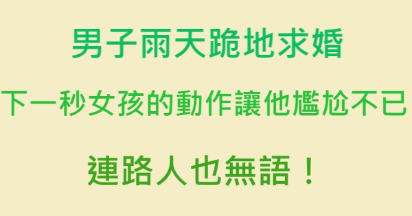 各位讀者安安阿~~我是有錢人這麼想小編Ant!今天要來說說關於「男子雨天跪地求婚,下一秒女孩的動作讓他尷尬不已,連路人也無語!」,不知道大家有沒有興趣呢!一起來看看吧!