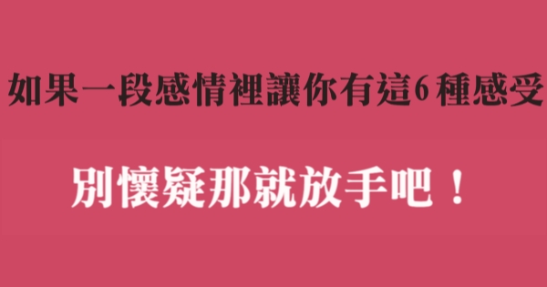 各位讀者安安阿~~我是有錢人這麼想小編Ant!今天要來說說關於「如果一段感情裡讓你有這6種感受,別懷疑那就放手吧!」,不知道大家有沒有興趣呢!一起來看看吧!