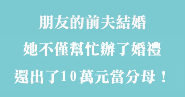各位讀者安安阿~~我是有錢人這麼想小編Ant!今天要來說說關於「朋友的前夫結婚,她不僅幫忙辦了婚禮,還出了10萬元當分母!」,不知道大家有沒有興趣呢!一起來看看吧!