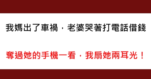大家好,我是 Choco 今天來跟你說說 我媽出了車禍,老婆哭著打電話借錢,奪過她的手機一看,我扇她兩耳光!吧!讓我們來看看!