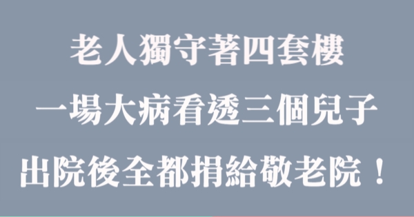 哈摟哈摟親愛的大家~~我是有錢人這麼想小編Choco!今天要來說說關「老人獨守著四套樓,一場大病看透三個兒子,出院後全都捐給敬老院!」的事件!讓我們一起來看看吧!