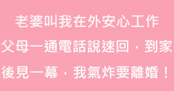大家好,我是有錢人這麼想小編Choco!今天要來說說關於老婆叫我在外安心工作,父母一通電話說速回,到家後見一幕,我氣炸要離婚!的事!不知道大家對於這個有多了解呢?一起來看看吧!