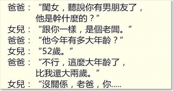 女兒:「跟你一樣,是個老闆。」爸爸:「他今年有多大年齡?」女兒:「52歲。」爸爸:「不行,這麼大年齡了,比我還大兩歲。」