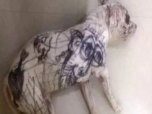 還有這種情形,也很囧~ 無辜的狗狗被畫成這樣還呼呼大睡,熊孩子看著自己的成果高興地手舞足蹈。