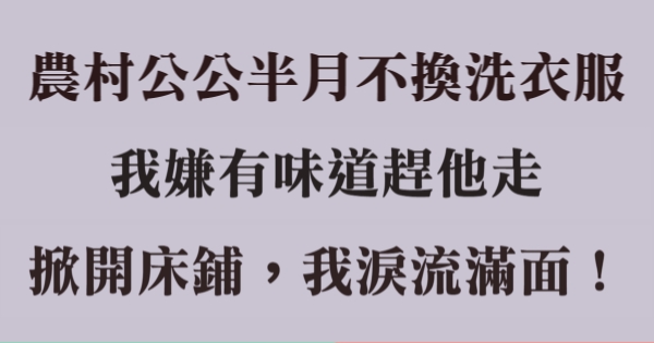 看完後是不是覺得Choco小編在有錢人這麼想分享的女人故事文章很好呢?想看更多好文,或是喜歡有錢人這麼想的文章的話,可以按讚追蹤真愛每一天並分享這篇農村公公半月不換洗衣服,我嫌有味道趕他走,掀開床鋪,我哽咽到哭!出去給大家一起看看喔!