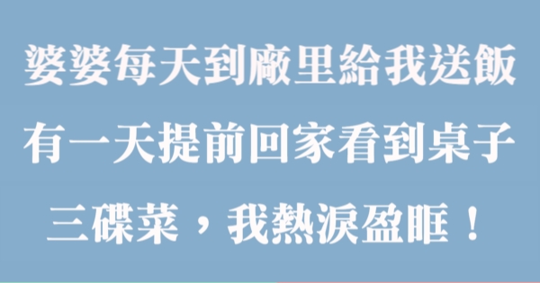 看完後是不是覺得Choco小編在有錢人這麼想分享的勵志故事文章讓人深思呢?想看更多好文,或是喜歡有錢人這麼想的文章的話,可以按讚追蹤每天來些正向能量快按讚並分享這篇「婆婆每天到廠里給我送飯,有一天提前回家看到桌子三碟菜,我熱淚盈眶!」出去給大家一起看看!