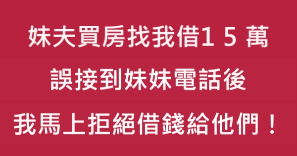 哈摟哈摟各位讀者~~我是有錢人這麼想小編Pineapple!今天要來說說關於「妹夫買房找我借15萬,誤接到妹妹電話後,我馬上拒絕借錢給他們!」,不知道大家有沒有興趣呢!一起來看看是怎麼樣的事吧!