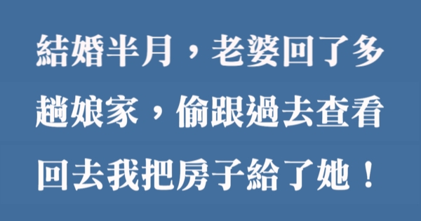 哈摟哈摟各位讀者~~我是有錢人這麼想小編Choco!今天要來說說關於「結婚半月,老婆回了多趟娘家,偷跟過去查看,回去我把房子給了她!」,不知道大家有沒有興趣呢!一起來看看是怎麼樣的事吧!