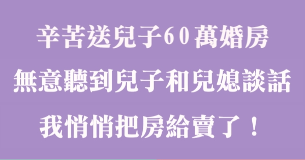 哈摟哈摟各位讀者~~我是有錢人這麼想小編Choco!今天要來說說關於「辛苦送兒子60萬婚房,無意聽到兒子和兒媳談話,我悄悄把房給賣了!」,不知道大家有沒有興趣呢!一起來看看是怎麼樣的事吧!